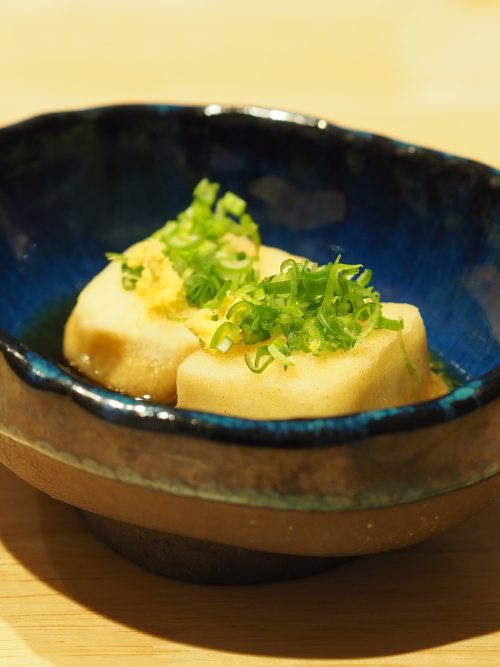 Agedashi tofu is very unique but very authentic. The combination of thinly battered tofu and Japanese traditional soup, which is called 'dashi' is perfect.